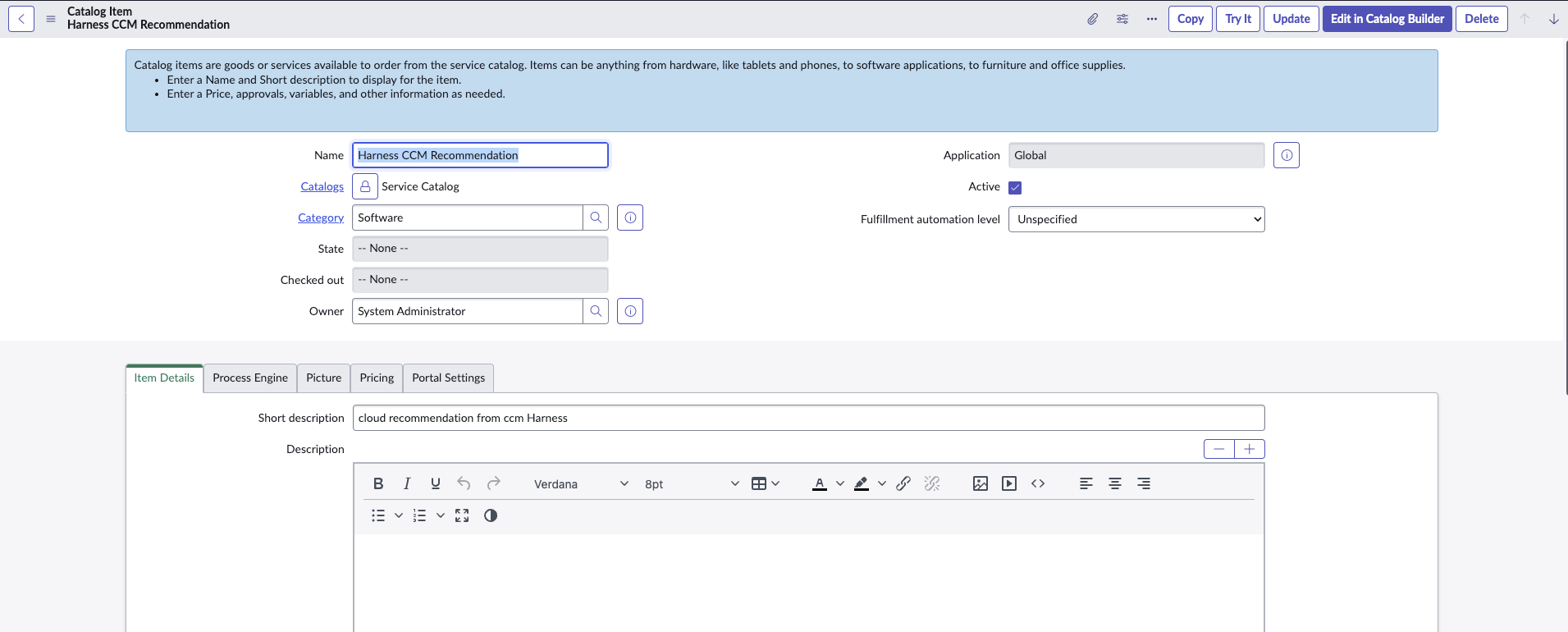 - Define a service catalog with the "Software" category. Ensure the name of the catalog item exactly matches "Harness CCM Recommendation" and mark it as Active.
