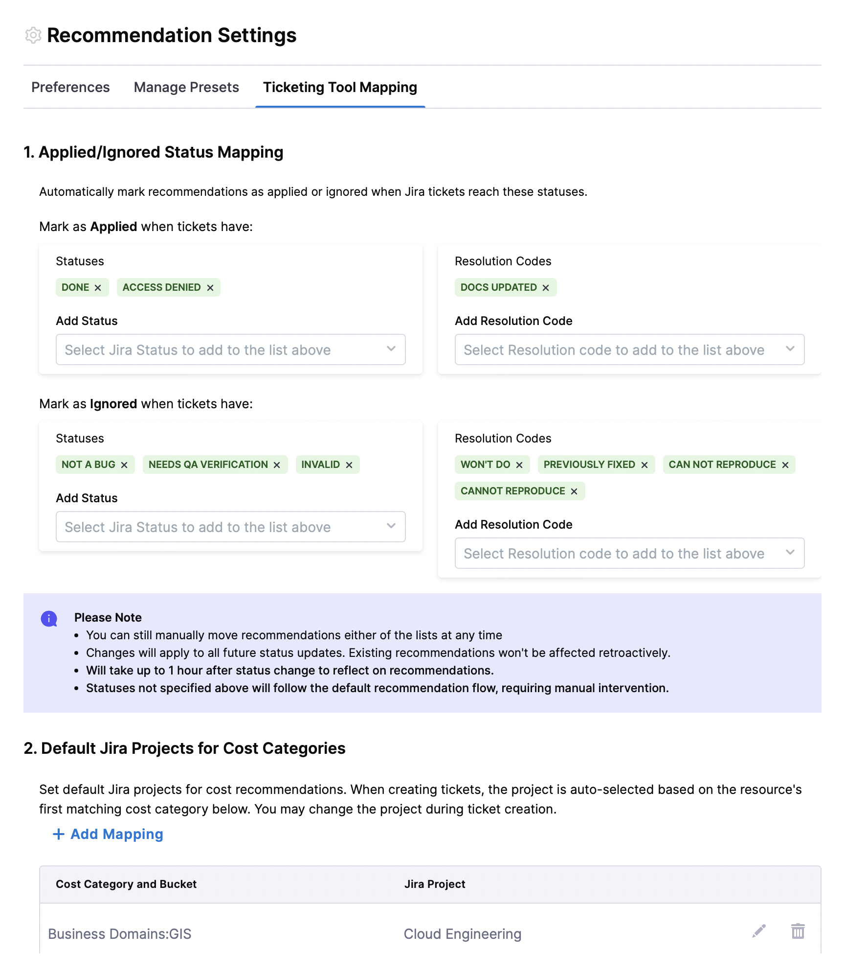 Jira Statuses that move recommendation to Applied automatically: Choose from a list of Jira statuses. Within an hour, CCM checks if any open recommendation is linked to a Jira issue with a mapped status, the recommendation is automatically updated to Applied.