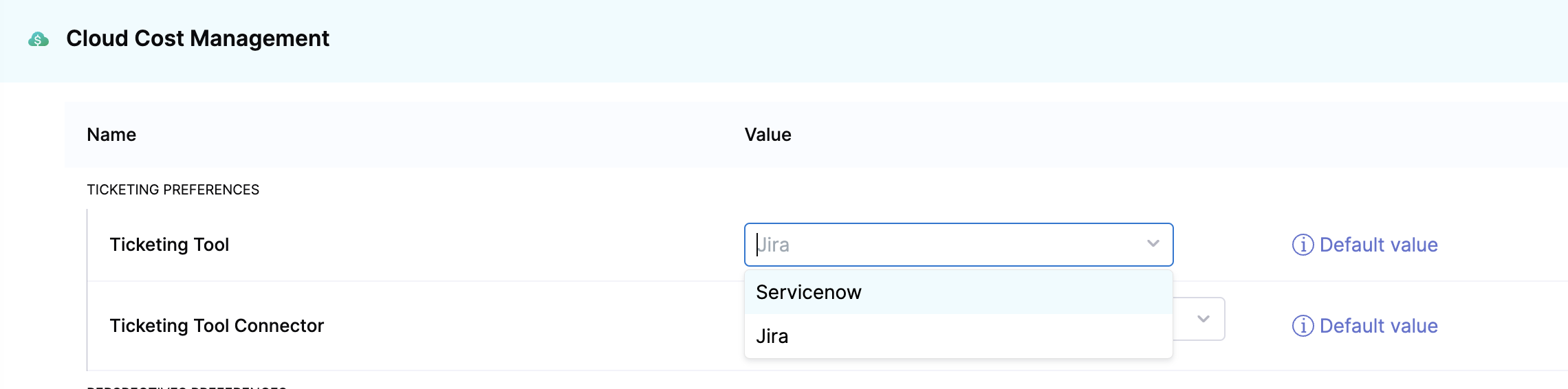 - Under Ticketing preferences, select the Ticketing tool and the Ticketing tool connector. The default ticketing tool is Jira. You can choose ServiceNow if that's the tool used in your organization. Switching your ticketing tool between Jira and ServiceNow results in the removal of the existing recommendation tickets.