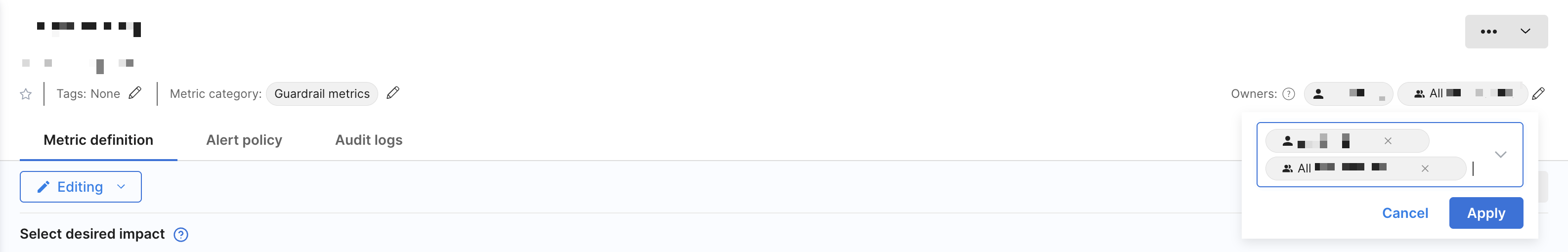 - For segments and metrics, navigate to the Owners section on the top right corner or click the Editing dropdown on the Definition tab. Select Restrict who can edit and add groups or individuals in the Editors field, then click Apply.