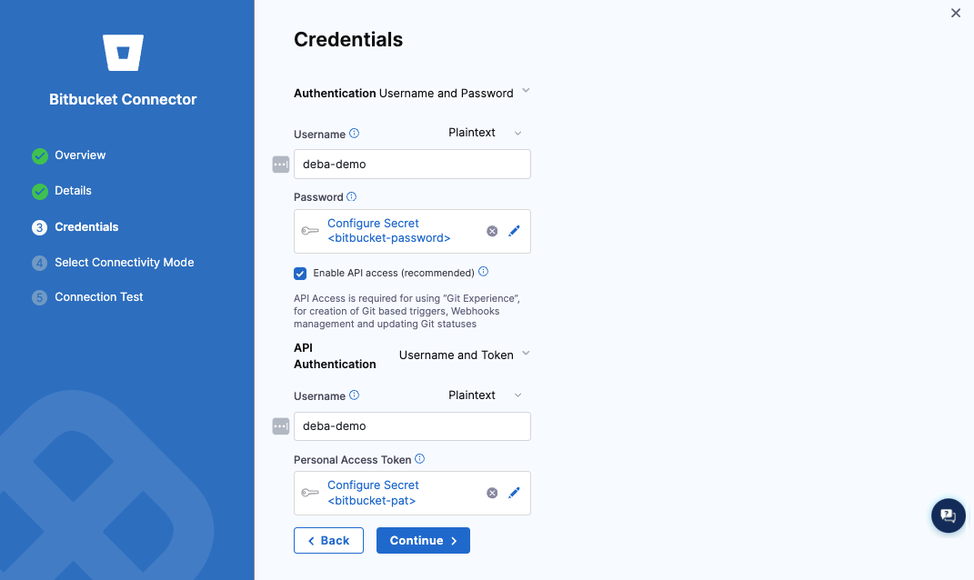 - Configure the Bitbucket connector settings.
