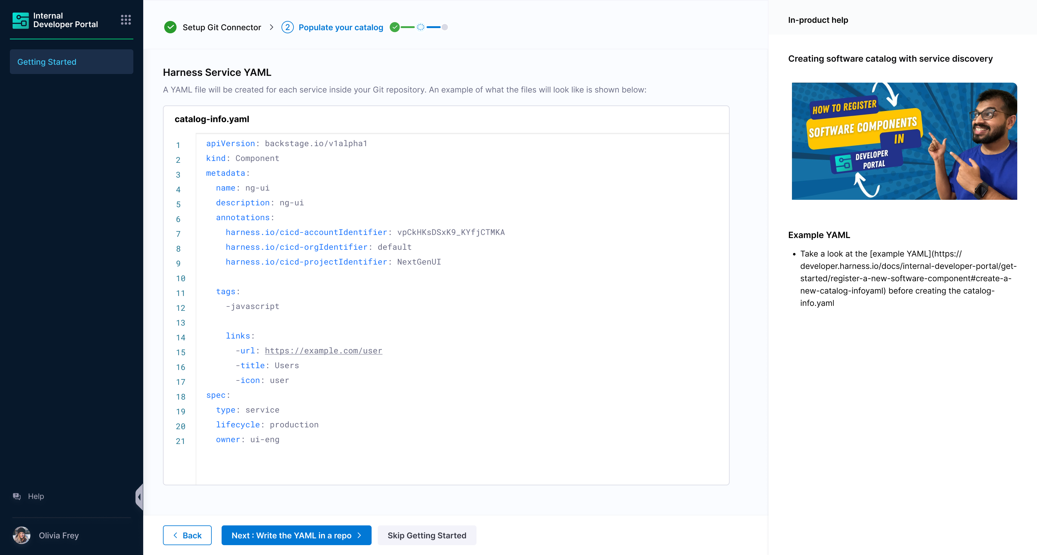 Users will now have option to onboard existing Harness services into IDP, or start with a sample service.