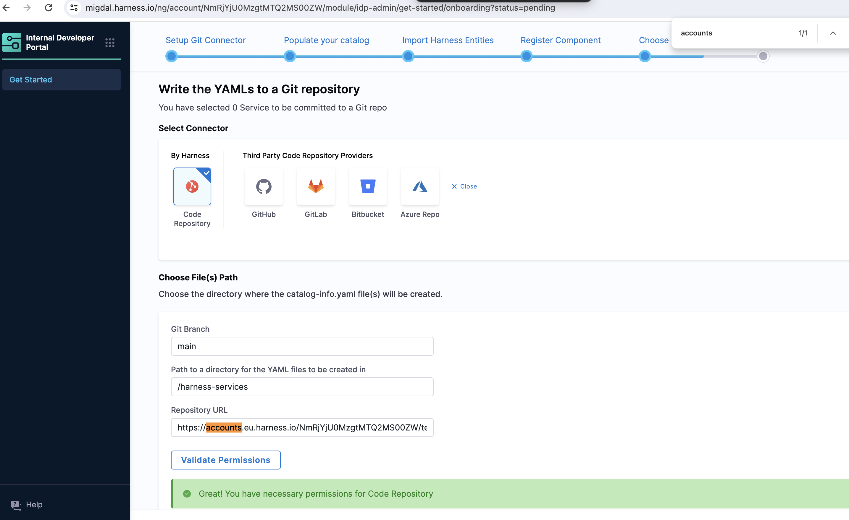 Validate the permission and the catalog-info.yaml files would be created in your directory in Code repository.
