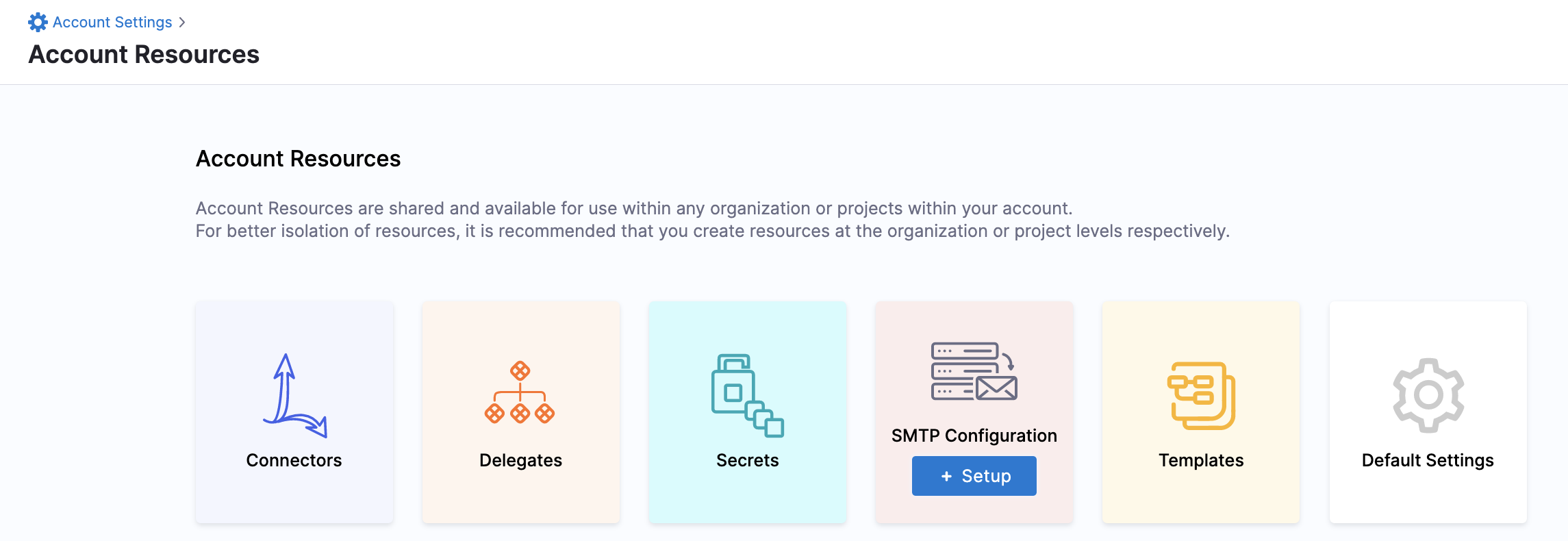 If necessary, you can configure the Default Settings differently at the account, org, and project scopes.
