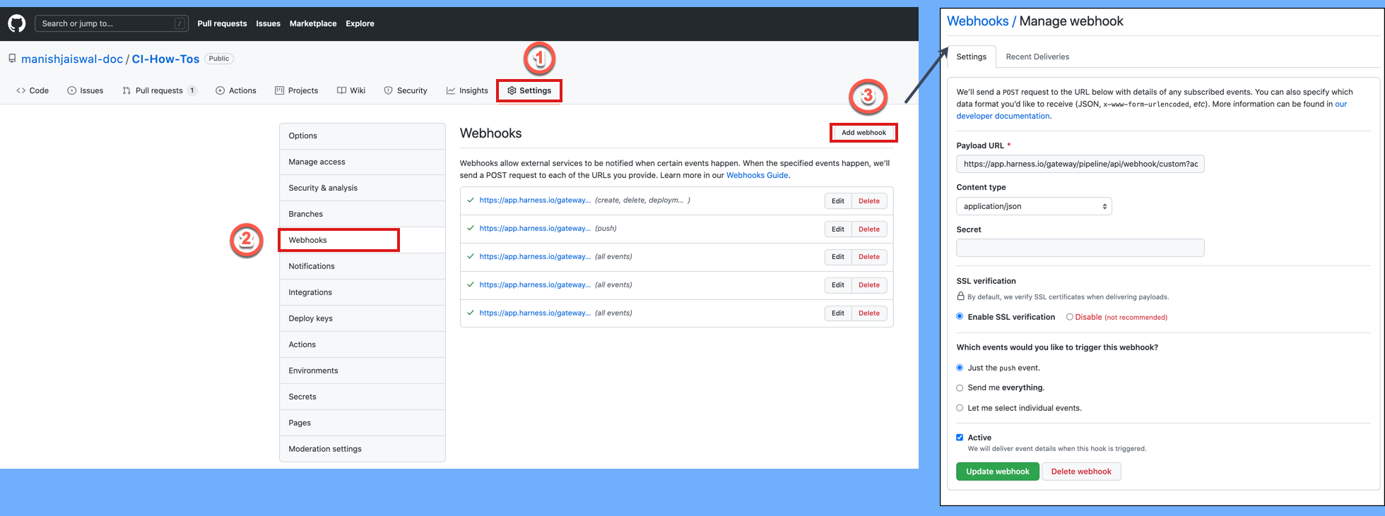 4. Log in to your repo in your SCM provider and navigate to the repo's webhook settings.